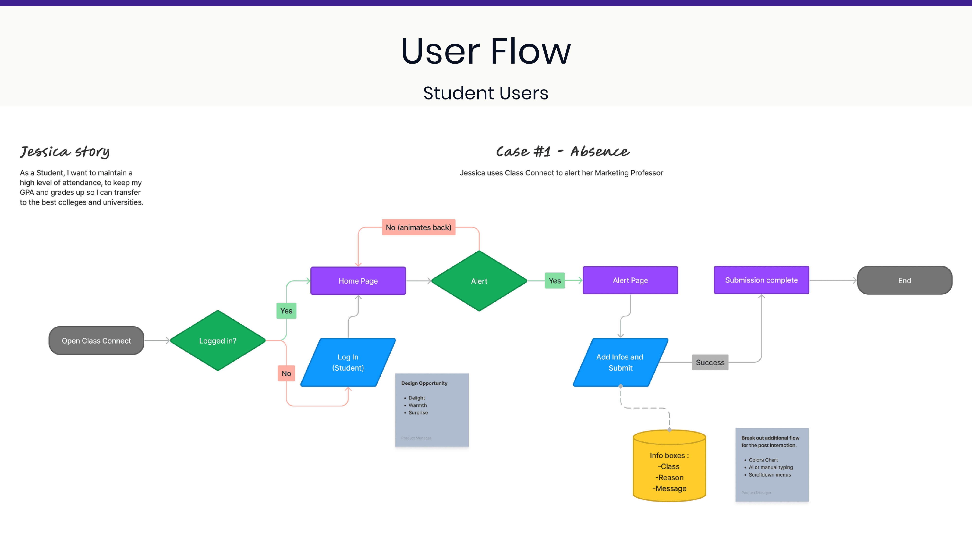 Class Connect reimagined attendance systems by bridging communication gaps through clear task flows for logging absences, tracking attendance, and sending reminders. Its user-friendly prototypes and interactive dashboards ensure seamless tracking, transparency, and engagement, effectively curbing absenteeism while strengthening the connection between students and professors at CUNY.